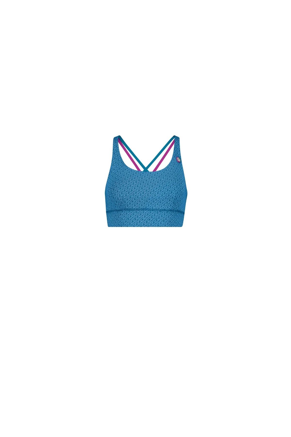 Tank top integrated bra in bielastic printed fabric. Organic cotton. Removable padding. Embroidery on the front. Elastic braces. Good comfort and good fit. Made in italy.